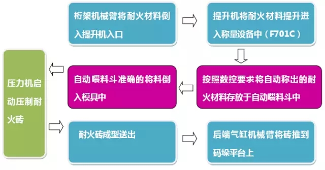 現(xiàn)有人工生產(chǎn)工藝為:粉料上料稱量—粉料倒入壓機模具—壓力機工作—取模—清潔模具—成品檢測,依托同類型鎂碳型耐火磚設計的全自動化生產(chǎn)線的經(jīng)驗,針對現(xiàn)有工藝進行解決方案的定制。